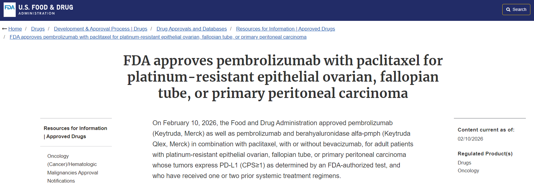 2月10日,美国食品药品监督管理局(FDA)批准帕博利珠单抗(Keytruda)以及帕博利珠单抗/透明质酸酶α-pmph复方制剂(商品名Keytruda Qlex)联合紫杉醇方案,联合或不联合贝伐珠单抗,用于治疗经FDA授权检测确定肿瘤表达PD-L1(综合阳性评分CPS≥1)且既往接受过一至二线全身治疗的铂耐药性上皮性...
