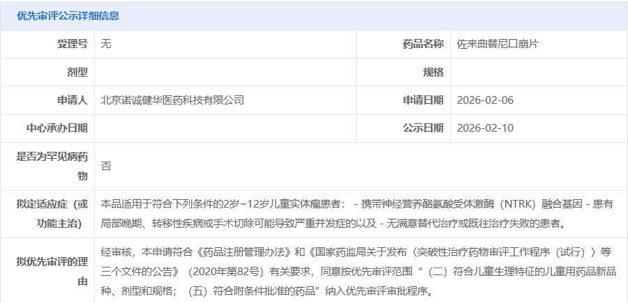 2月10日,国家药品监督管理局药品审评中心(CDE)显示:佐来曲替尼口崩片拟纳入优先审评,适用于符合下列条件的2岁-12岁儿童实体瘤患者: - 携带神经营养酪氨酸受体激酶(NTRK)融合基因 - 患有局部晚期、转移性疾病或手术切除可能导致严重并发症的以及 - 无满意替代治疗或既往治疗失败的患者。