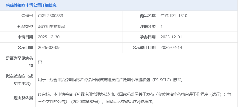 2月9日,国家药品监督管理局药品审评中心(CDE)显示:注射用ZL-1310拟纳入突破性治疗,用于一线含铂治疗期间或治疗后出现疾病进展的广泛期小细胞肺癌(ES-SCLC)患者。