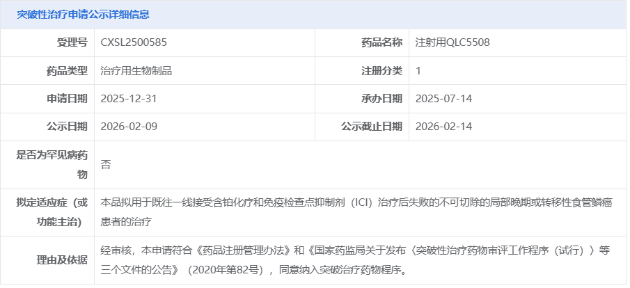 2月9日,国家药品监督管理局药品审评中心(CDE)显示:注射用QLC5508拟纳入突破性治疗,用于既往一线接受含铂化疗和免疫检查点抑制剂(ICI)治疗后失败的不可切除的局部晚期或转移性食管鳞癌患者的治疗。