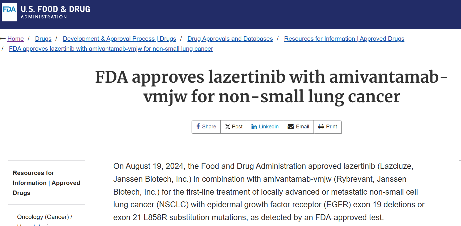 8月19日,美国食品药品监督管理局(FDA)批准拉泽替尼(Lazcluze)联合埃万妥单抗(Rybrevant,amivantamab-vmjw)用于一线治疗表皮生长因子受体(EGFR)外显子19缺失或外显子21 L858R替换突变的局部晚期或转移性非小细胞肺癌(NSCLC)。